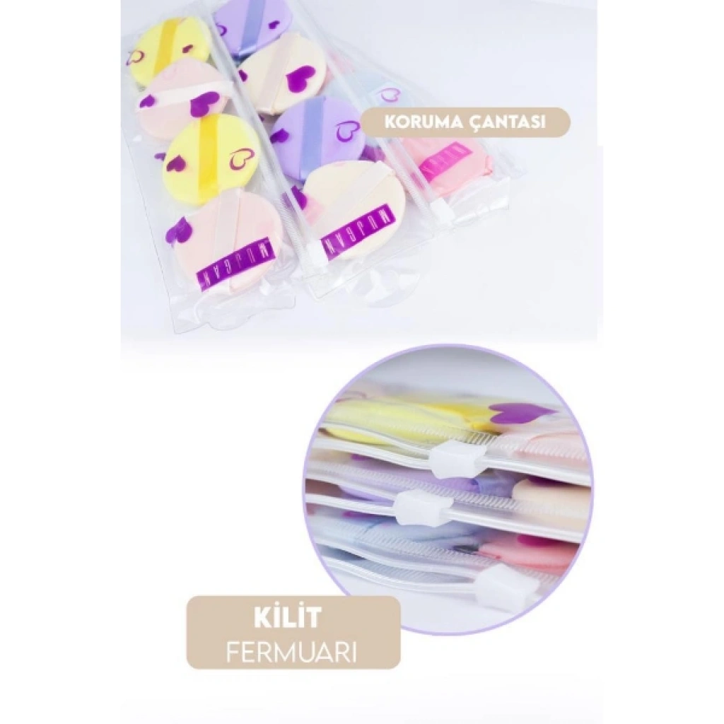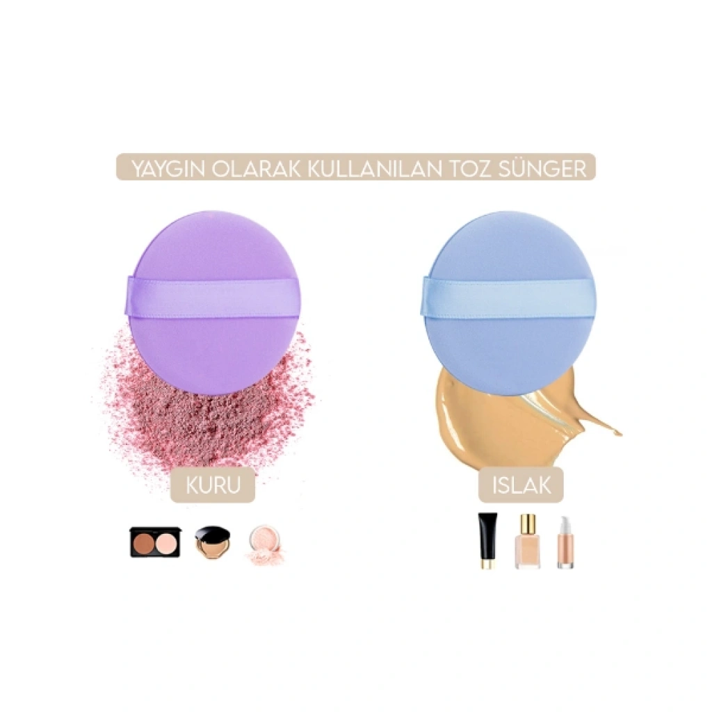 4'LÜ TUTMALI PUDRA MAKYAJ SÜNGERİ PUF SETİÜrün Özellikleri4'lü tutmalı pudra makyaj süngeri puf seti, hem kuru hem de ıslak kullanım imkânı sunarak ten makyajında pratik ve dengeli uygulama sağlar. Yuvarlak formu sayesinde yüz hatlarına kolayca uyum sağlar ve pudra, fondöten gibi ürünlerin cilde eşit şekilde dağıtılmasına yardımcı olur. Tutmalı makyaj pufu tasarımı arka kısmındaki elastik bant sayesinde ele rahatça oturur ve kontrollü kullanım imkânı sunar. Yumuşak dokulu yüzeyi ürünün cilt üzerinde homojen dağılmasına destek olurken, makyajın daha pürüzsüz görünmesine katkı sağlar. Pudra süngeri puf seti hem sabitleme işlemlerinde hem de ten ürünlerinin uygulanmasında tercih edilebilir. Kuru kullanımda toz ürünler için, hafif nemli kullanımda ise sıvı ve krem form ürünler için uygundur. 4'lü makyaj süngeri seti farklı renk seçenekleri ile birlikte gönderilir ve günlük makyajdan profesyonel uygulamalara kadar geniş kullanım alanı sunar.Ürün Teknik Özellikleri Özellik Açıklama Ürün Adı 4'lü Tutmalı Pudra Makyaj Süngeri Puf Seti Malzeme Yumuşak makyaj süngeri materyali Renk Görseldeki renklerden oluşan setler karışık gönderilir Kullanım Alanı Pudra ve ten makyajı uygulaması Paket İçeriği4 adet tutmalı pudra makyaj süngeri puf