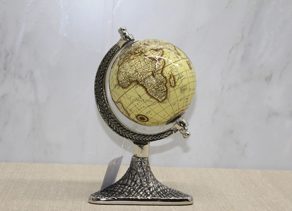 DEKORATİF MASAÜSTÜ DÜNYA KÜRE - MODEL 6Ürün ÖzellikleriDekoratif Masaüstü Dünya Küre - Model 6, klasik sarı tonlu harita tasarımı ve detaylı metal görünümlü ayak yapısıyla bulunduğu ortama zarif ve nostaljik bir hava kazandırır. 24x16 cm ölçüsü sayesinde daha kompakt bir form sunarak dar alanlarda dahi rahatlıkla konumlandırılabilir. Özellikle kitaplık rafları, çalışma masası köşeleri ve ofis sehpası üzerinde şık bir tamamlayıcı olarak kullanılabilir. Antik atlas stilini andıran yüzey tasarımı, dekorasyonda entelektüel bir dokunuş arayanlar için ideal bir seçimdir. masaüstü dünya küre olarak hem dekoratif hem de koleksiyon niteliğinde değerlendirilebilen bu model, klasik detayları seven kullanıcılar için öne çıkar. Gövde kısmındaki sıcak tonlu harita rengi ile altındaki desenli ayak formu uyumlu bir bütünlük oluşturur. Dengeli stand yapısı sayesinde sağlam bir duruş sergileyen dekoratif dünya küresi, ev ve ofis dekorasyonuna karakter katan özel bir aksesuardır.Ürün Teknik Özellikleri Özellik Açıklama Ürün Adı Dekoratif Masaüstü Dünya Küre - Model 6 Boyut 24 x 16 cm Kullanım Türü Masaüstü Tasarım Klasik Sarı Tonlu Atlas Kullanım Alanı Ev, Ofis, Kitaplık Paket İçeriği1 Adet Dekoratif Masaüstü Dünya Küre - Model 6