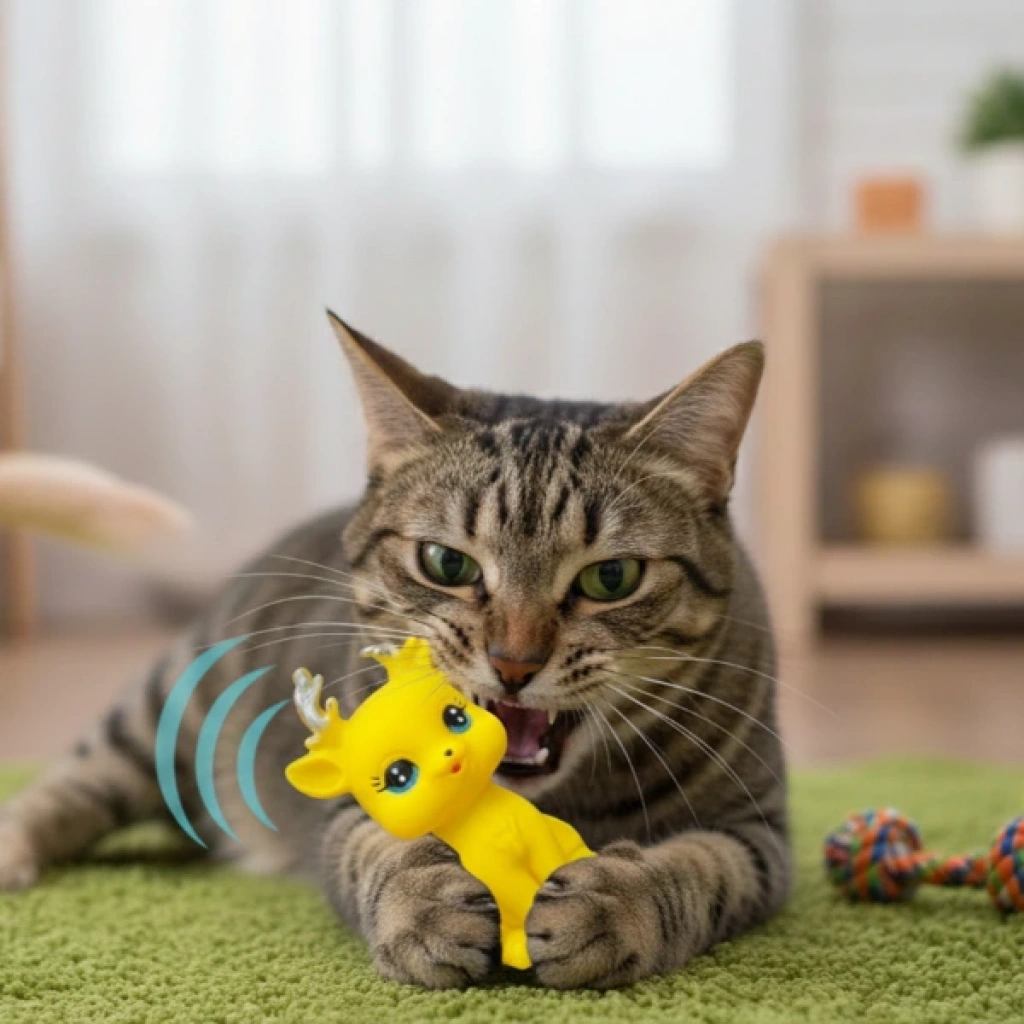 EVCİL HAYVAN SESLİ GEYİK ŞEKLİNDE PLASTİK OYUNCAKÜrün ÖzellikleriEvcil Hayvan Sesli Geyik Şeklinde Plastik Oyuncak, sevimli geyik tasarımı ve canlı renkleriyle kedilerin ve küçük ırk köpeklerin ilgisini çeken eğlenceli bir oyuncaktır. Sıkıldığında ses çıkaran mekanizması sayesinde evcil hayvanların oyun içgüdüsünü harekete geçirir ve enerjisini atmasına yardımcı olur. Dayanıklı plastik yapısı uzun ömürlü bir kullanım sunarken, hafif ve kolay taşınabilir yapısı ile ev içinde her alanda rahatlıkla kullanılabilir. Oyuncak tekli olarak satılır ve renk seçeneği bulunmadığından görseldeki renklerden biri karışık olarak gönderilir. Temizliği kolaydır ve günlük oyun aktivitelerinde güvenle kullanılabilir.Paket İçeriği1 adet Sesli Geyik Şeklinde Plastik Oyuncak