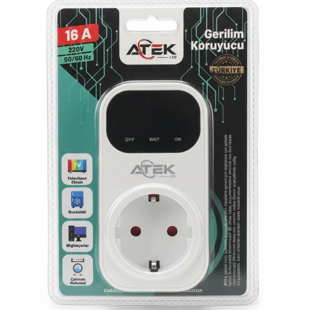 GERİLİM KORUYUCU PRİZÜrün ÖzellikleriGerilim Koruyucu Priz, ev ve iş yerlerindeki elektronik cihazları yüksek voltaj, düşük voltaj ve ani elektrik dalgalanmalarına karşı korumak için tasarlanmış akıllı bir güvenlik çözümüdür. Özellikle buzdolabı, televizyon, çamaşır makinesi, bilgisayar gibi hassas cihazların elektronik kartlarını koruyarak uzun ömürlü kullanım sağlar. 16A kapasitesi ile yüksek güç gerektiren cihazlarda güvenle kullanılabilir.Akıllı gecikme sistemi sayesinde elektrik kesintisi sonrası voltaj stabil hâle gelene kadar enerjiyi geciktirir ve cihazlarınızı güvenli voltaj aralığında çalıştırır. OFF–WAIT–ON LED göstergeleri ile priz durumu net bir şekilde takip edilebilir. Kolay tak-çalıştır tasarımı sayesinde herhangi bir montaj gerektirmez. Türkiye üretimi olması, kalite ve güvenilirliği artırırken uzun süreli kullanım için ekstra dayanıklılık sunar.Elektrik kaynaklı arızaları ve yüksek maliyetli cihaz hasarlarını önlemek isteyen kullanıcılar için ideal bir koruyucu aksesuar olan Gerilim Koruyucu Priz, hem ev hem de iş yerlerinde güvenli bir enerji yönetimi sağlar.Paket İçeriği1 adet gerilim koruyucu priz