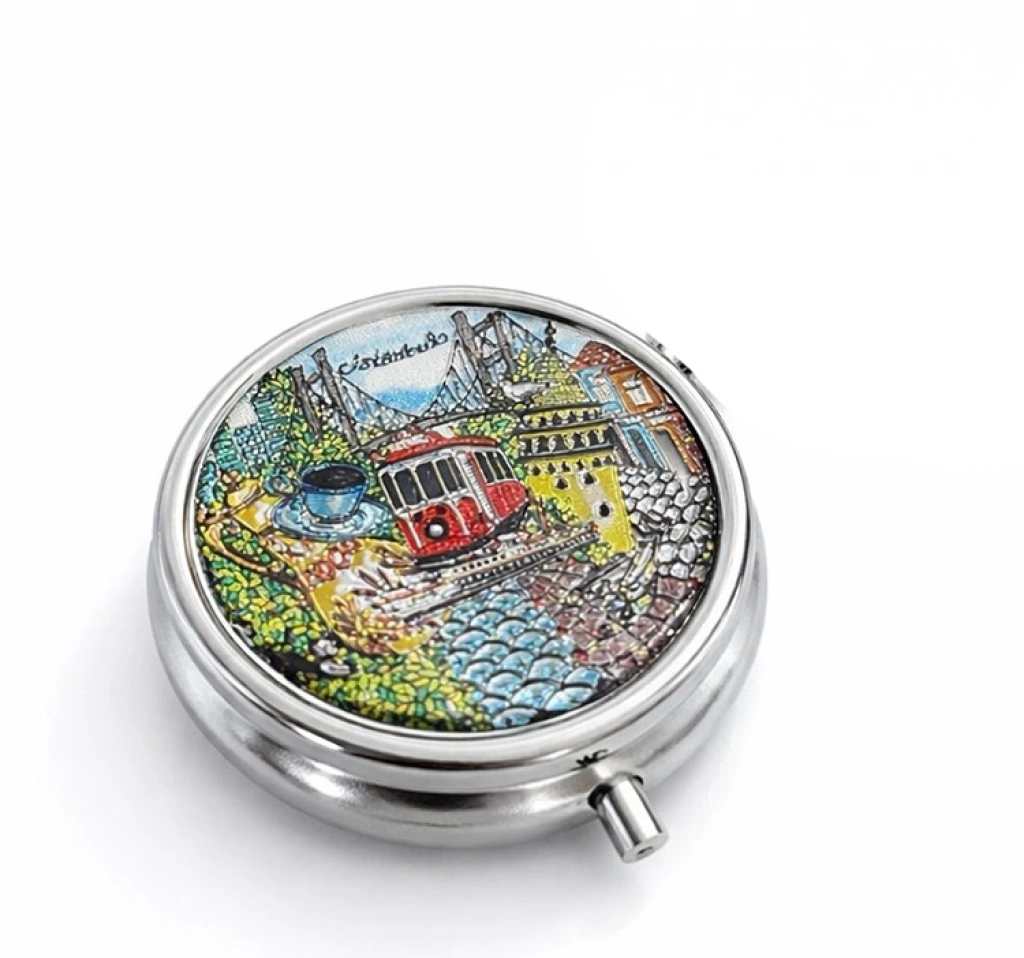 İSTANBUL TEMALI İLAÇ KUTUSU - MODEL 15Ürün ÖzellikleriSağlığınızı takip ederken İstanbul’un eşsiz manzarasını yanınızda taşıyın! İstanbul Temalı Metal İlaç Kutusu (Model 15), nostaljik İstiklal Caddesi ve meşhur Kırmızı Tramvay illüstrasyonu ile hem sanatsal hem de son derece fonksiyonel bir aksesuardır. 5x5 cm boyutlarındaki kompakt yapısı sayesinde çanta, cep veya cüzdanlarda rahatlıkla taşınabilir. Yüksek kaliteli paslanmaz metal gövdesi, ilaçlarınızı ve takviyelerinizi dış etkenlerden korurken, güvenli kilit mekanizması kendiliğinden açılmaları önler. İç kısmında bulunan bölmeli yapısı, farklı ilaçlarınızı birbirine karışmadan düzenli bir şekilde saklamanıza olanak tanır. Hem günlük kullanım için pratik bir yardımcı hem de İstanbul tutkunları için zarif ve anlamlı bir hatıra eşyasıdır.Ürün Teknik ÖzellikleriÖzellikAçıklamaBoyutlar5 cm x 5 cm (Cep Boyu)MalzemePaslanmaz Parlak Metal GövdeTema / Tasarımİstanbul İstiklal Caddesi & Tramvay İllüstrasyonuİç YapıBölmeli Düzenleyici HazneKapak MekanizmasıGüvenli Bas-Aç Kilit SistemiKullanım Alanıİlaç, Vitamin, Takviye Saklama ve Seyahat KullanımıPaket İçeriği1 Adet İstanbul Temalı Metal İlaç Kutusu - Model 15.