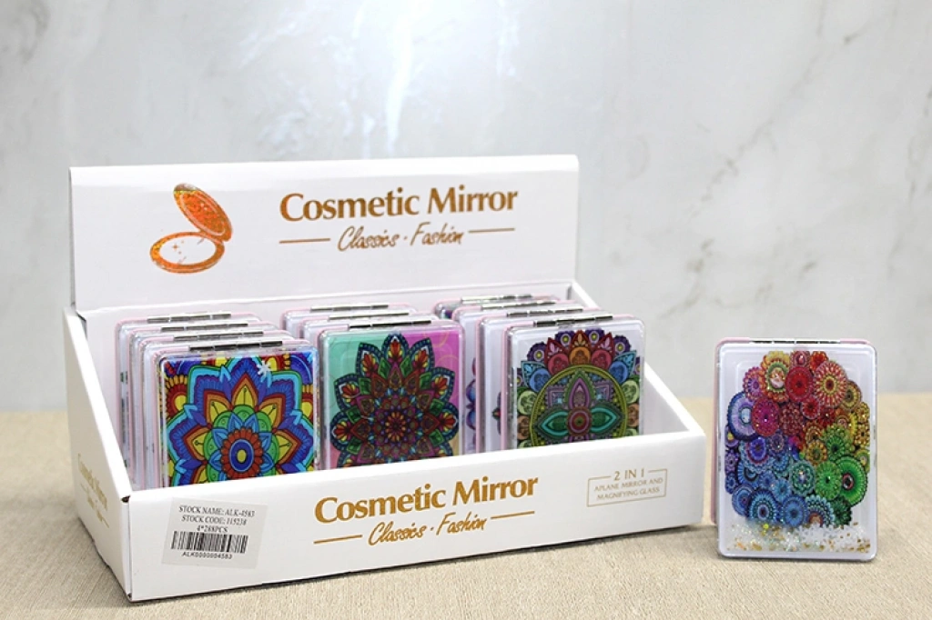 MANDALA DESENLİ HAREKETLİ SULU EL AYNASI - MODEL 2Ürün ÖzellikleriMandala Desenli Hareketli Sulu El Aynası - Model 2, dış yüzeyinde yer alan sulu ve simli kapak tasarımıyla dikkat çeken dekoratif bir el aynasıdır. Mandala desenli ön yüzeyi estetik ve renkli bir görünüm sunarken, kapak içindeki hareketli simli sıvı detay ürüne dinamik ve eğlenceli bir karakter kazandırır. Klasik cep aynalarından ayrılan hareketli sulu simli kapak tasarımı sayesinde hem görsel olarak dikkat çeker hem de farklı bir kullanım deneyimi sunar. Kompakt ölçüsü sayesinde çanta içinde rahatlıkla taşınabilen bu model, günlük kullanım için pratik bir mandala desenli el aynası alternatifi sunar. 8,5x6 cm boyutundaki yapısı elde rahat tutulur ve fazla yer kaplamaz. Görselde bulunan modellerden biri karışık olarak gönderilir. Estetik tasarımıyla öne çıkan bu ürün, özel günler ve organizasyonlar için değerlendirilebilecek şık bir hediyelik el aynası seçeneğidir.Ürün Teknik ÖzellikleriÖzellikAçıklamaÜrün AdıMandala Desenli Hareketli Sulu El Aynası - Model 2Boyut8,5 x 6 cmTasarımMandala Desenli ve Sulu Simli KapakGönderimModellerden Biri Karışık Olarak GönderilirKullanım AlanıKişisel Kullanım ve HediyelikPaket İçeriği1 Adet Mandala Desenli Hareketli Sulu El Aynası - Model 2