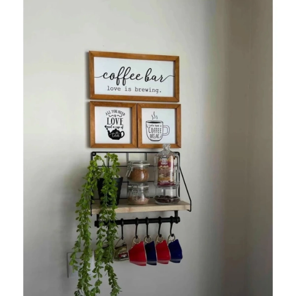 METAL ASKILIKLI KAHVE KÖŞESİ RAFIÜrün ÖzellikleriMetal askılıklı kahve köşesi rafı, mutfağınızda düzeni ve şıklığı bir arada sunar. Üst kısmı ahşap raf, alt kısmı ise metal boru üzerine yerleştirilmiş 6 adet sağlam askılıktan oluşur. Duvara monte edilebilen bu dekoratif düzenleyici, kahve fincanlarınızı, küçük tabakları, kavanozları ve mutfak aksesuarlarını estetik bir biçimde sergilemenize olanak tanır. Mutfak tezgâh üstü alanlarda veya kahve köşelerinde fonksiyonel ve modern bir görünüm yaratır. Metal iskeleti sayesinde uzun ömürlü kullanım sağlar. Az yer kaplayan tasarımı ile dar alanlarda bile pratik çözümler sunar.Ürün ölçüleri; uzunluk 42 cm, genişlik 13 cm, yükseklik 20 cm'dir. Paket İçeriği1 Adet Metal Askılıklı Kahve Köşesi Rafı