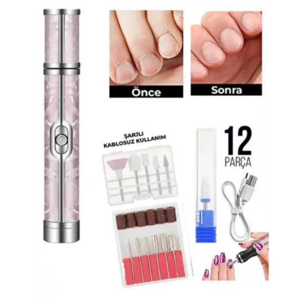ŞARJLI MANİKÜR PEDİKÜR TIRNAK BAKIM SETİÜrün ÖzellikleriEvde profesyonel tırnak bakımı yapmanın en pratik yolu! Şarjlı Manikür Pedikür Seti, kablosuz kullanım özgürlüğü ve 12 farklı başlığıyla tırnaklarınızı dilediğiniz her an kusursuz bir görünüme kavuşturur. Ergonomik tasarımı ve güçlü motoru sayesinde tırnak yüzeyini parlatma, şekillendirme, tırnak etlerini temizleme ve nasır giderme işlemlerini saniyeler içinde zahmetsizce halleder. USB üzerinden kolayca şarj edilebilir olması, kablo karmaşasını ortadan kaldırarak size her açıda tam kontrol sağlar. Şık mor mermer desenli gövdesi ile sadece işlevsel değil, aynı zamanda estetik bir kişisel bakım aksesuarıdır. Hem doğal tırnaklarda hem de protez veya jel tırnak uygulamalarında güvenle kullanılabilir. Çantanızda taşıyabileceğiniz kompakt boyutu sayesinde seyahatlerinizde de yanınızdan ayırmayacağınız bu profesyonel tırnak bakım seti, kuaför salonuna gitmeye gerek kalmadan ellerinizde ve ayaklarınızda pürüzsüz, sağlıklı bir görünüm sağlar.Ürün Teknik ÖzellikleriÖzellikAçıklamaÜrün AdıŞarjlı Kablosuz Tırnak Bakım SetiParça Sayısı12 Parça Aksesuar ve Başlık SetiKullanım TürüŞarjlı / Kablosuz Özgür KullanımŞarj TipiUSB Şarj Kablosu DahilUygulama AlanıManikür, Pedikür, Şekillendirme, ParlatmaRenk/DesenMor Mermer Temalı TasarımUyumlulukDoğal Tırnak, Akrilik, Jel ve Protez TırnakPaket İçeriği1 Adet Şarjlı Tırnak Bakım Cihazı