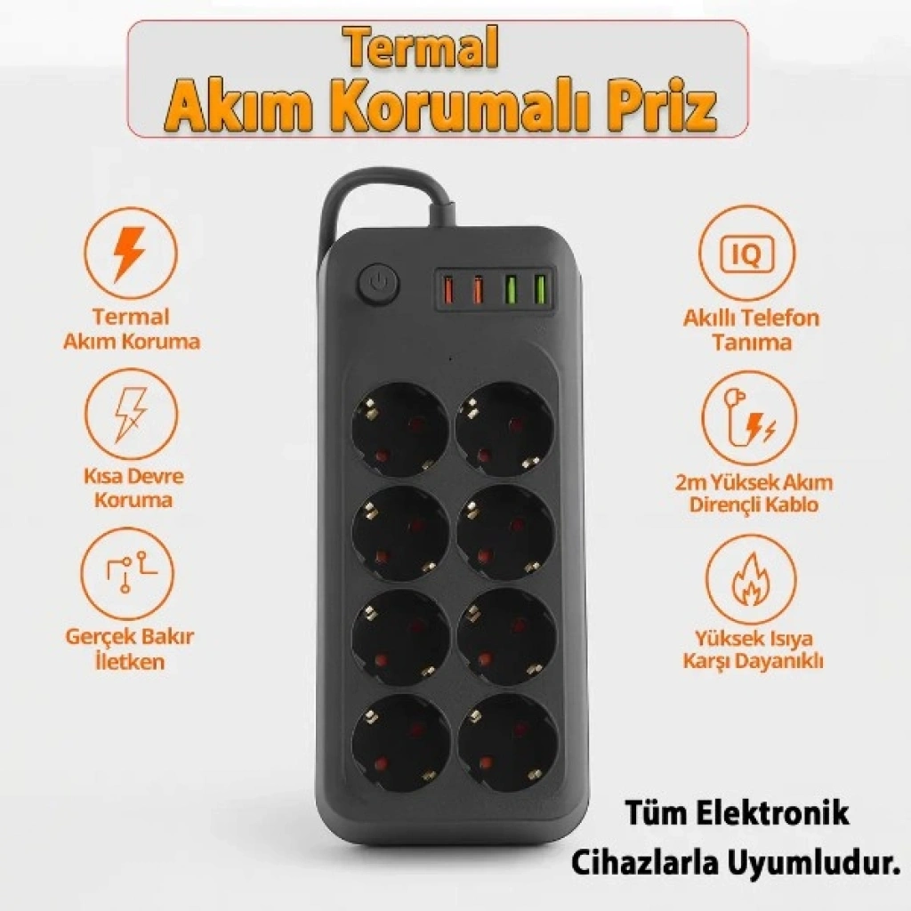 TERMAL AKIM KORUMALI 8 PRİZLİ UZATMA KABLOSU Ürün ÖzellikleriDeğerli elektronik cihazlarınızı güvence altına alın! Termal Akım Korumalı 8 Prizli Uzatma Kablosu, yüksek teknolojili koruma sistemleri ile hem evinizde hem de ofisinizde güvenli bir enerji istasyonu kurmanızı sağlar. 8 adet AC priz girişinin yanı sıra üzerinde yer alan 4 adet USB girişi, akıllı telefon ve tabletlerinizi adaptör gerektirmeden şarj etmenize olanak tanır. Akıllı telefon tanıma (IQ) teknolojisi sayesinde cihazınıza uygun akımı otomatik olarak belirleyerek pil sağlığını korur. Termal akım koruması ve kısa devre koruması özellikleri, ani voltaj dalgalanmalarında ve aşırı yüklenmelerde elektriği keserek cihazlarınızın zarar görmesini engeller. 2 metre uzunluğundaki yüksek akım dirençli kablosu ve gerçek bakır iletkenleri ile maksimum verimlilik sunan bu ürün, yüksek ısıya dayanıklı gövde yapısı sayesinde uzun ömürlü ve güvenilir bir kullanım vaat eder.Ürün Teknik ÖzellikleriÖzellikAçıklamaPriz Sayısı8 Adet Standart Priz GirişiUSB Girişi4 Adet USB Şarj Portu (IQ Akıllı Tanıma Özellikli)Kablo Uzunluğu2 Metre Yüksek Akım Dirençli KabloKoruma TeknolojileriTermal Akım Koruması, Kısa Devre Korumasıİletken MalzemesiGerçek Bakır İletken YapısıGüvenlikYüksek Isıya Karşı Dayanıklı Gövde & Açma/Kapama AnahtarıUyumlulukTüm Elektronik Cihazlarla Tam UyumPaket İçeriği1 Adet Termal Akım Korumalı 8 Prizli ve 4 USB Girişli Uzatma Kablosu (2 Metre).